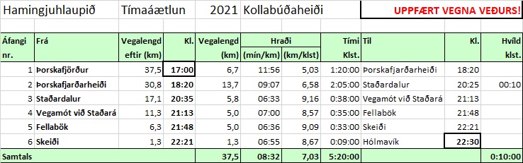 Nákvæm tímasetning er háð því hvernig gengur í hlaupi nr. 3. - Miðvikudagur 7. júlí 2021, kl. 15:30: