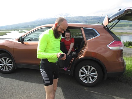 Við Systragil beið Björk aðalbílstjóri eftir Bryndísi og öðrum hlaupurum sem vantaði far til Akureyrar.