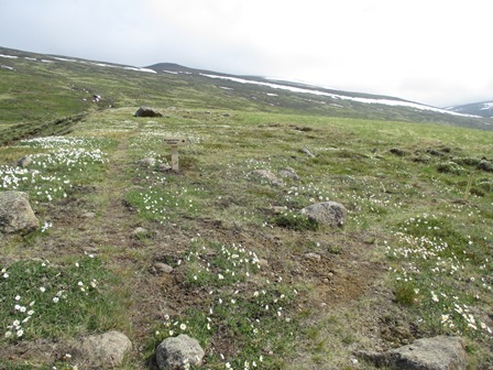 Hvað sem líður öllum vangaveltum um leiðsögn og GPS-punkta er leiðin upp Þingmannaveginn svo sem ekki vandrötuð. Eftir að hafa steðjað nákvæmlega 940 m beint upp hlíðina komum við að skilti á suðurbakka Brekkulækjar, sem vísaði á Þingmannhnjúk til hægri. Fæst okkar ætluðu svo sem á Þingmannahnjúk en rétta leiðin er samt í stefnu þangað, yfir efstu túnin fyrir ofan Eyrarland og áfram yfir Þingmannalæk. Líklega hittum við ekki alveg á stystu leiðina að þeim stað þar sem farið er yfir lækinn, en það var svo sem aukaatriði. Við lækinn tók ég GPS-punkt til síðari nota og innan við lækinn varð Þingmannavegurinn greinilegri. Vegurinn þarna upp sneiðingana hefur greinilega verið kerrufær fyrr á árum enda leiðin fjölfarin.