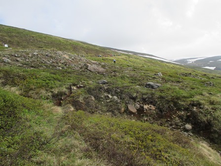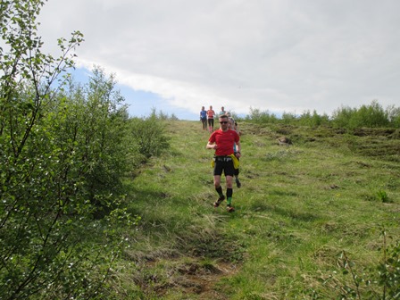 Á leiðréttingarkaflanum upp frá Hróarsstöðum mætti ég nokkrum hlaupurum sem höfðu fylgt fordæmi mínu í villunni. Þessu fólki smalaði ég náttúrulega til baka og ekki leið á löngu þar til við vorum komin á þann stað þar sem ég hefði átt að taka krappa hægri beygju rétt norðan við Bæjargil (sjá GPS-punkta fremst í kaflanum). Þá var ekkert annað eftir en að drífa sig niður snarbratta brekkuna ofan við tjaldstæðið og niður á veg þar sem hlaupið átti að enda. Og stuttu seinna var allur hópurinn kominn á leiðarenda.