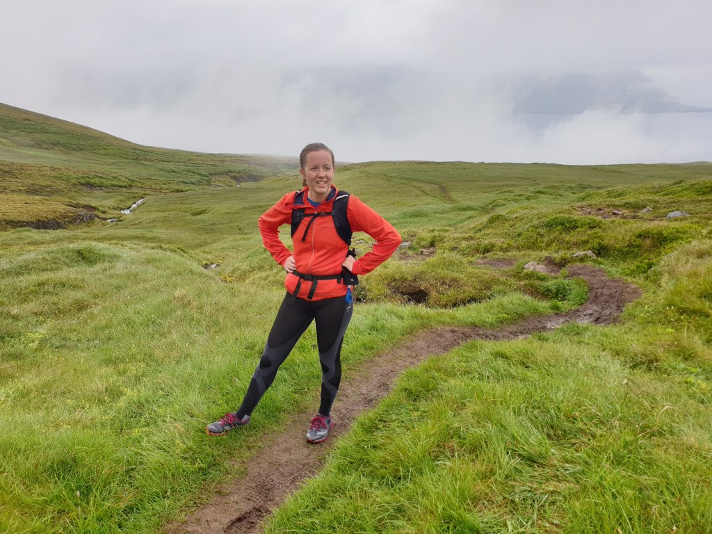 Leiðin úr Brúnavíkurskarði niður í Brúnavík var greið og fljótfarin. Á leiðinni hlupum við framhjá fossi og mættum fáeinum göngumönnum, en annars bar fátt til tíðinda. Þokan var gisnari þegar neðar dró og við fengum sæmilegt útsýni yfir víkina, afskaplega grösugt land með stórbrotna kletta upp af fjörunni. Við áðum stutta stund við neyðarskýli Landsbjargar niðri í víkinni og fengum þýsk hjón til að aðstoða okkur við myndatöku. Að skýlinu voru 4,7 km frá upphafsstaðnum skv. okkar mælingum en væru líklega um 4,3 km ef miðað væri við Kolbeinsfjöru.