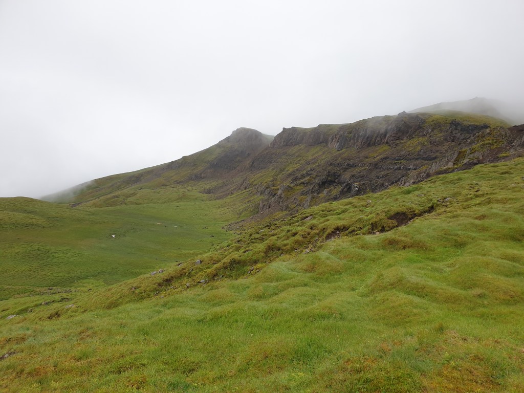 Þegar við vorum komin upp úr fjörunni komum við fljótlega auga á stíginn áleiðis inn eftir víkinni með stefnu á Súludal. Haftjörn var þarna á sínum stað og þegar við komum framhjá henni fór þokan að þéttast.