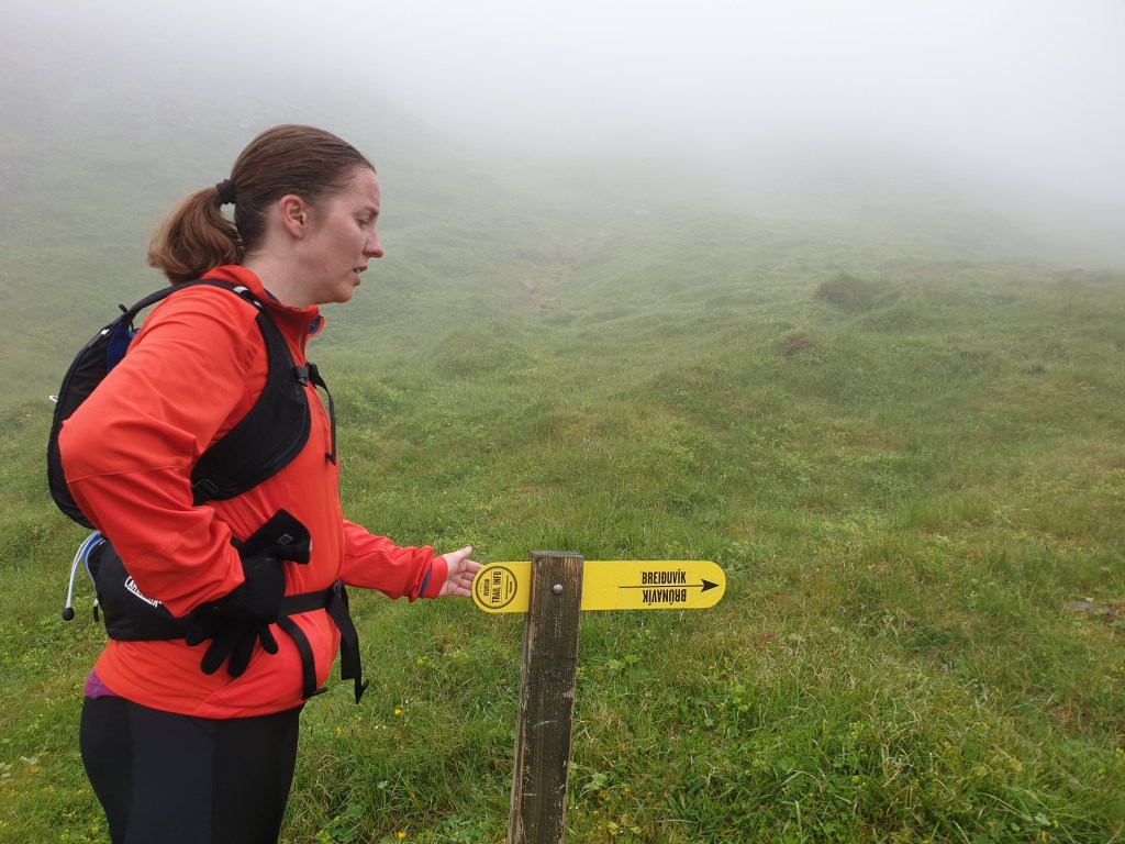 Leiðin upp í Brúnavíkurskarð er ekki ýkja löng og þangað vorum við komin fyrr en varði. Þetta var auðratað, greinilegur slóði alla leið og nýlega búið að endurnýja merkingar. Vegalengdin upp í skarðið mældist 2,9 km en hefði líklega verið nær 2,5 km ef við hefðum farið rétta leið frá upphafi. Þarna voru 45 mín liðnar og hæðarmælirinn sýndi 362 m.