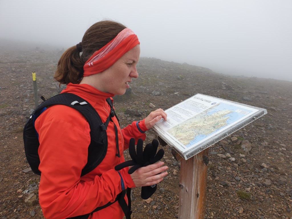 Eftir að hafa metið stöðuna með hjálp korts sem sett hafði verið upp þarna á krossgötunum ákváðum við að ég myndi koma mér niður í Kjólsvík með hjálp GPS-úrsins, en Gitta myndi láta gott heita og taka stefnuna á Þrándarhrygg. Hún var reyndar ekki með GPS-tæki en hafði þó kort meðferðis og við gerðum líka ráð fyrir að leiðin yrði sæmilega auðrötuð eftir stikum. Það var reyndar ofmat, því að stikurnar voru gamlar og máðar og sama mátti reyndar segja um merkingu leiðarinnar niður í Kjólsvík. En allt gekk þetta samt að óskum.