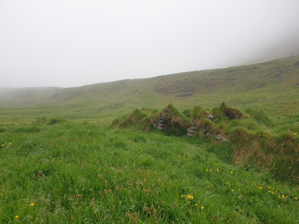 Eftir að leiðir skildu reyndi ég að flýta mér sem mest niður í Kjólsvík. En sú ferð varð miklu seinlegri en ég hafði reiknað með. Ég týndi stikunum fljótlega í þokunni en fann þó slóðann annað slagið. Þess á milli hélt ég bara stefnu beint niður bratta hlíðina og tók mið af lækjum sem hlutu að renna til sjávar. Í úrinu mínu átti ég GPS-punkt hjá bæjarrústunum í Kjólsvík og þangað hlaut ég að komast að endingu þó að mér þætti ferðalagið ögn óþægilegt. Landið var líka forblautt og dálítið sleipt á köflum. Líklega fór ég aðeins of sunnarlega niður til að byrja með, en þarna eru kröpp gil þannig að maður getur ekki farið alveg hvar sem er. Auðvitað fann ég endapunktinn að lokum en þurfti að vísu að fara talsverðan spöl þvert á leið í blálokin. Það villti örlítið fyrir mér hversu norðarlega í víkinni bærinn hafði staðið, en eftir á að hyggja hefur þetta sjálfsagt verið eina bæjarstæðið. Sunnar í víkinni eru snarbrattir sjávarkambar sem virðast síður en svo ákjósanlegir fyrir mannabústaði. Sama fannst mér reyndar gilda um alla víkina þennan dag og hugsaði að hún væri kjörinn staður fyrir drungalega atburði.