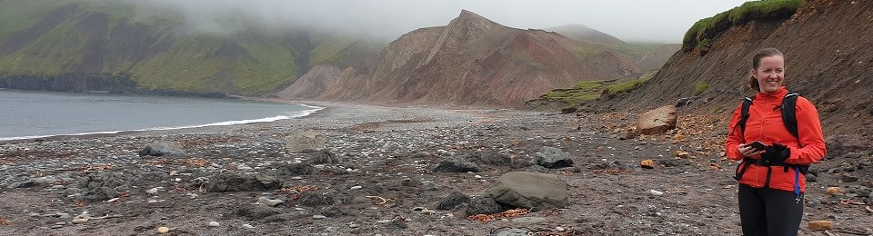 Handan við ána beið okkar þessi afar sérstæða fjara, sem ég held að megi segja að sé helsta einkenni Brúnavíkur. Fjaran sjálf er flöt eins og þægileg baðströnd og upp af henni rísa brattir líparitklettar sem ramma inn sérstöðuna. Þegar maður stendur þarna niðri í fjörunni er ekki augljóst hvert halda skuli, en við vissum þó að leiðin lá inn í landið á nýjan leik og þá skiptir líklega ekki öllu máli hvar er ráðist til uppgöngu.