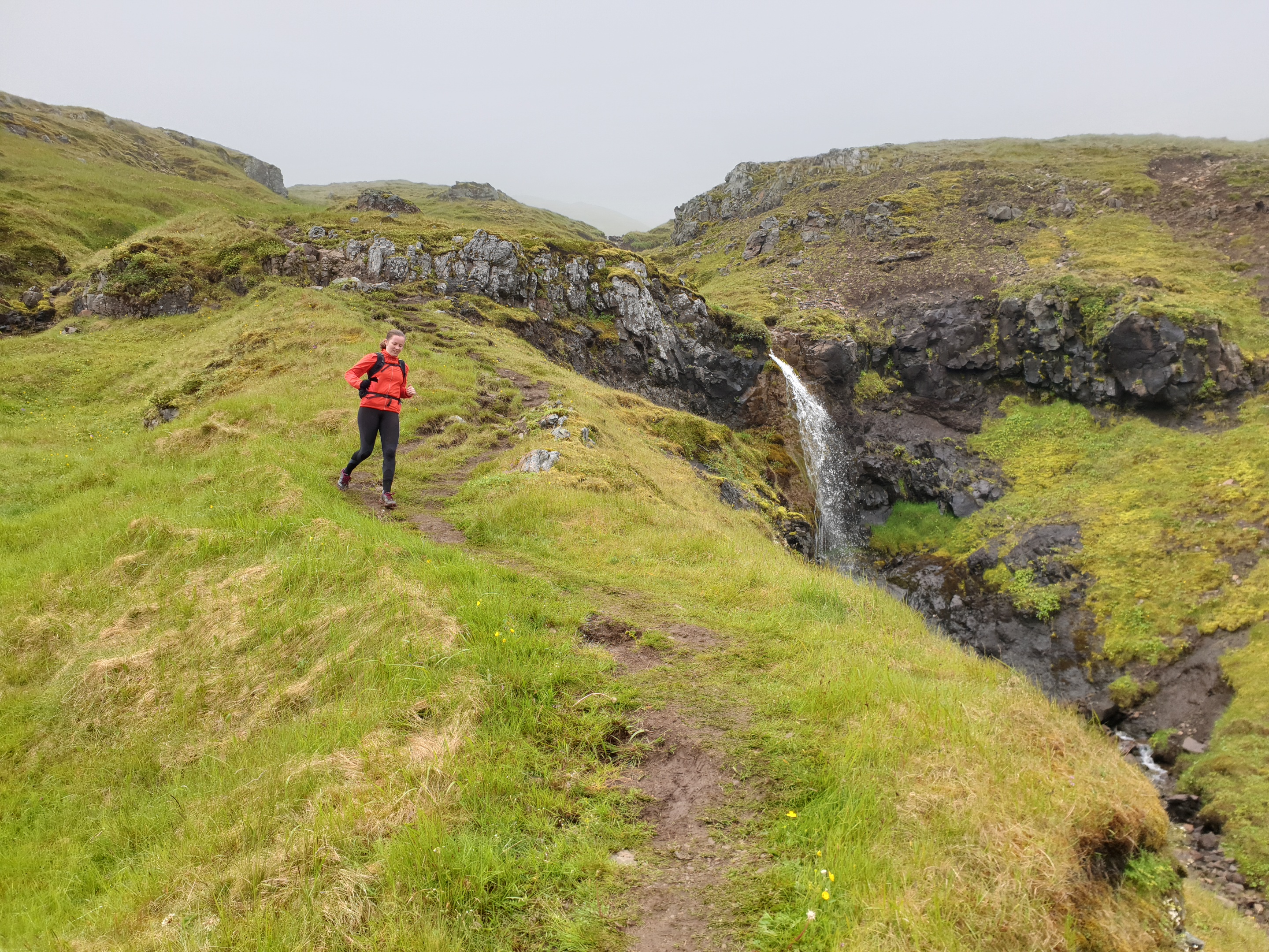 Leiðin úr Brúnavíkurskarði niður í Brúnavík var greið og fljótfarin. Á leiðinni hlupum við framhjá fossi og mættum fáeinum göngumönnum, en annars bar fátt til tíðinda. Þokan var gisnari þegar neðar dró og við fengum sæmilegt útsýni yfir víkina, afskaplega grösugt land með stórbrotna kletta upp af fjörunni. Við áðum stutta stund við neyðarskýli Landsbjargar niðri í víkinni og fengum þýsk hjón til að aðstoða okkur við myndatöku. Að skýlinu voru 4,7 km frá upphafsstaðnum skv. okkar mælingum en væru líklega um 4,3 km ef miðað væri við Kolbeinsfjöru.