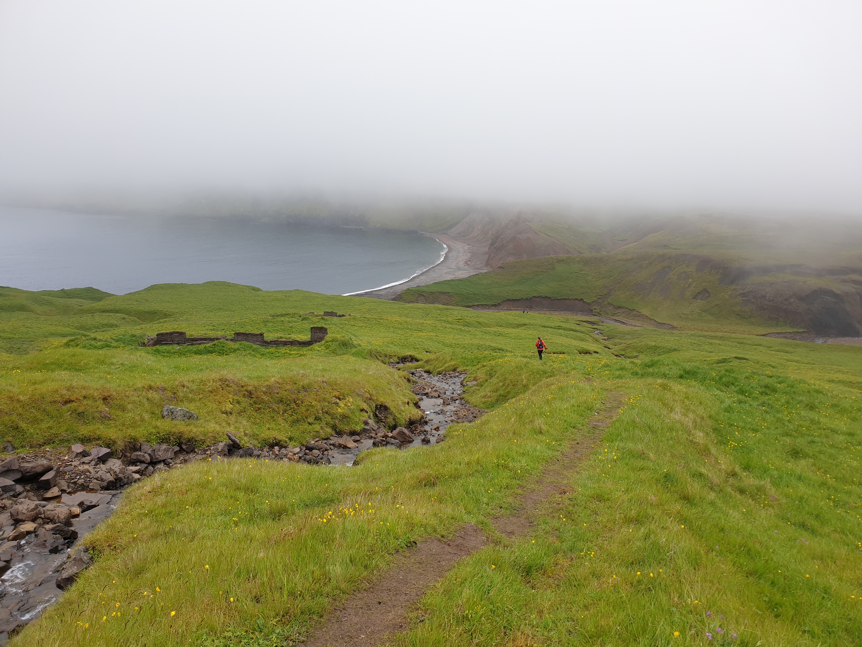 Eftir að leiðir skildu reyndi ég að flýta mér sem mest niður í Kjólsvík. En sú ferð varð miklu seinlegri en ég hafði reiknað með. Ég týndi stikunum fljótlega í þokunni en fann þó slóðann annað slagið. Þess á milli hélt ég bara stefnu beint niður bratta hlíðina og tók mið af lækjum sem hlutu að renna til sjávar. Í úrinu mínu átti ég GPS-punkt hjá bæjarrústunum í Kjólsvík og þangað hlaut ég að komast að endingu þó að mér þætti ferðalagið ögn óþægilegt. Landið var líka forblautt og dálítið sleipt á köflum. Líklega fór ég aðeins of sunnarlega niður til að byrja með, en þarna eru kröpp gil þannig að maður getur ekki farið alveg hvar sem er. Auðvitað fann ég endapunktinn að lokum en þurfti að vísu að fara talsverðan spöl þvert á leið í blálokin. Það villti örlítið fyrir mér hversu norðarlega í víkinni bærinn hafði staðið, en eftir á að hyggja hefur þetta sjálfsagt verið eina bæjarstæðið. Sunnar í víkinni eru snarbrattir sjávarkambar sem virðast síður en svo ákjósanlegir fyrir mannabústaði. Sama fannst mér reyndar gilda um alla víkina þennan dag og hugsaði að hún væri kjörinn staður fyrir drungalega atburði.