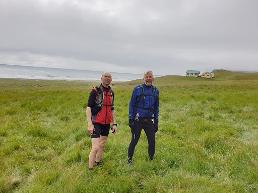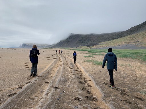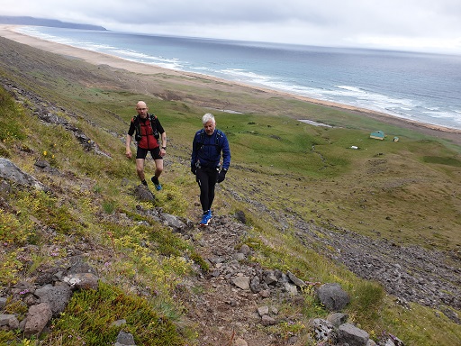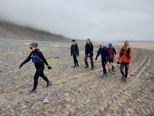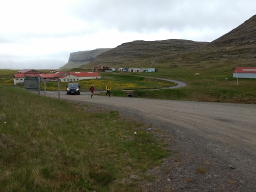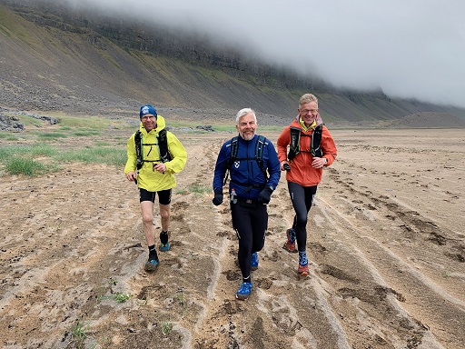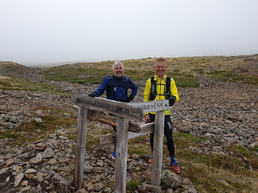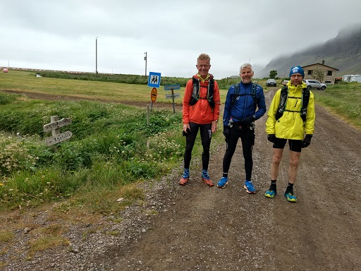 Hlaupið yfir Hnjótsheiði var seinna fjallvegahlaupið af tveimur þennan laugardag. Með mér í för voru Birkir bóndi, sem hafði líka fylgt mér yfir Sandsheiði í súldinni fyrr um daginn, og Hringur Baldvinsson úr Hafnarfirði. Auk þeirra slógust átta göngumenn með í för. Þau lögðu ögn fyrr af stað enda reiknuðu þau með að verða lengur á leiðinni en við þremenningarnir.