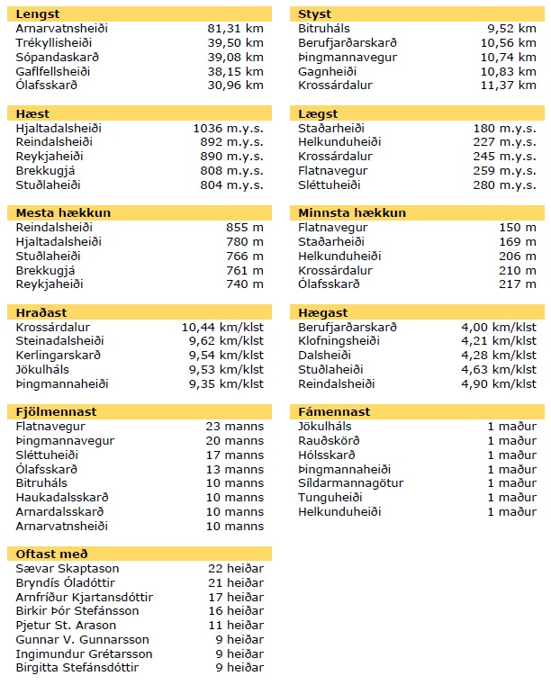 Þessi síða hefur að geyma hinar ólíklegustu staðreyndir sem tengjast fjallvegahlaupaverkefninu 2007-2017, svo sem um hæstu fjallvegina, mestu vegalengdirnar, fjölmennustu hlaupin, og þar fram eftir götunum. Fremur ber að líta á þessar töflur sem skemmtiefni en vísindi.